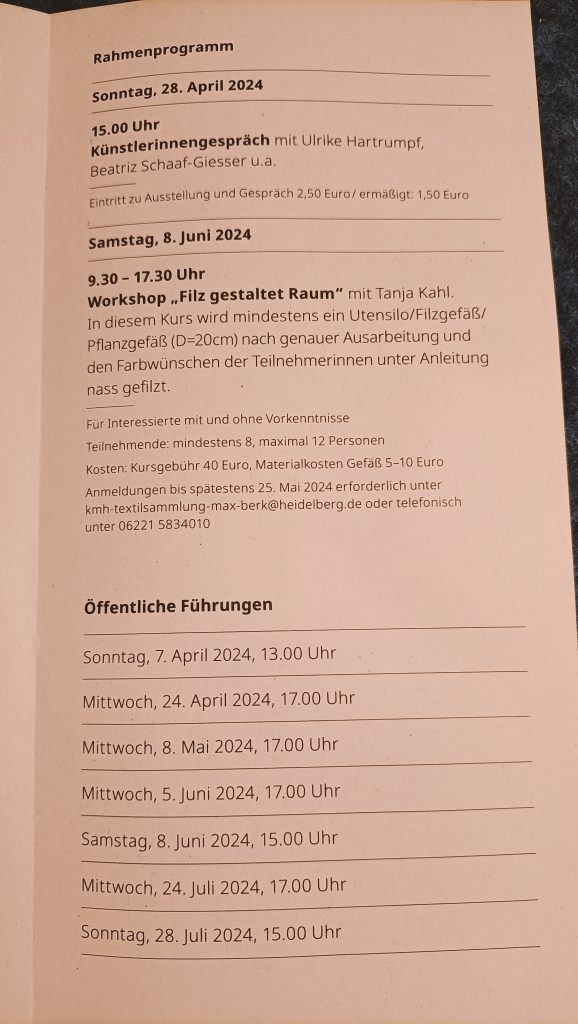 Ausstellungen 18.03.-01.05.2018 Filznetzwerk 2.Mitgliederausstellung Marienmünster 07.07-08-07.2018 Abschlussausstellung in Oberrot filzKunsT Tanja Kahl filzKunsT Tanja Kahl Filz gestaltet Raum Ausstellung Vom 24.03.2024 – 28.07.2024 Textilsammlung Max Berk in Heidelberg